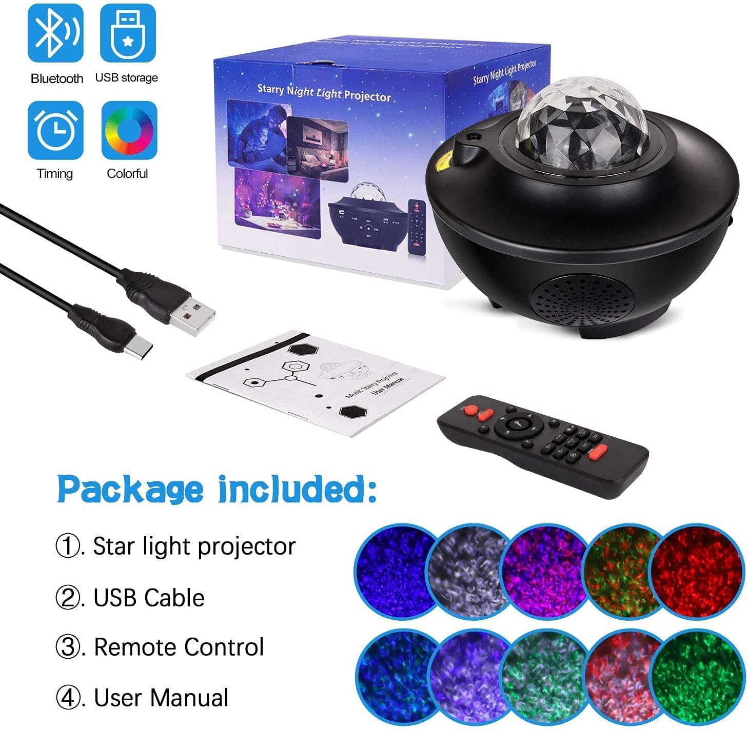 NCLUYE: 1 Proyector de galaxia, 1 Control s/ baterías, 1 Cable USB
